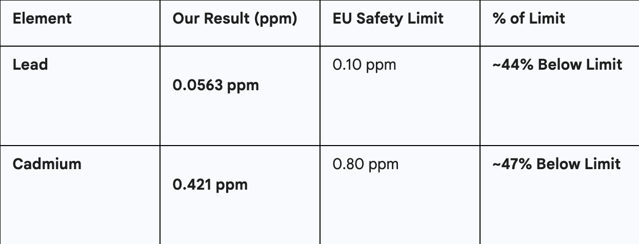 The Reality of "Zero": There is no such thing as "zero" lead or cadmium in an earth-grown product, but we are dealing in very small quantities - our result of 0.0563 ppm is equivalent to one minute in 38 years.